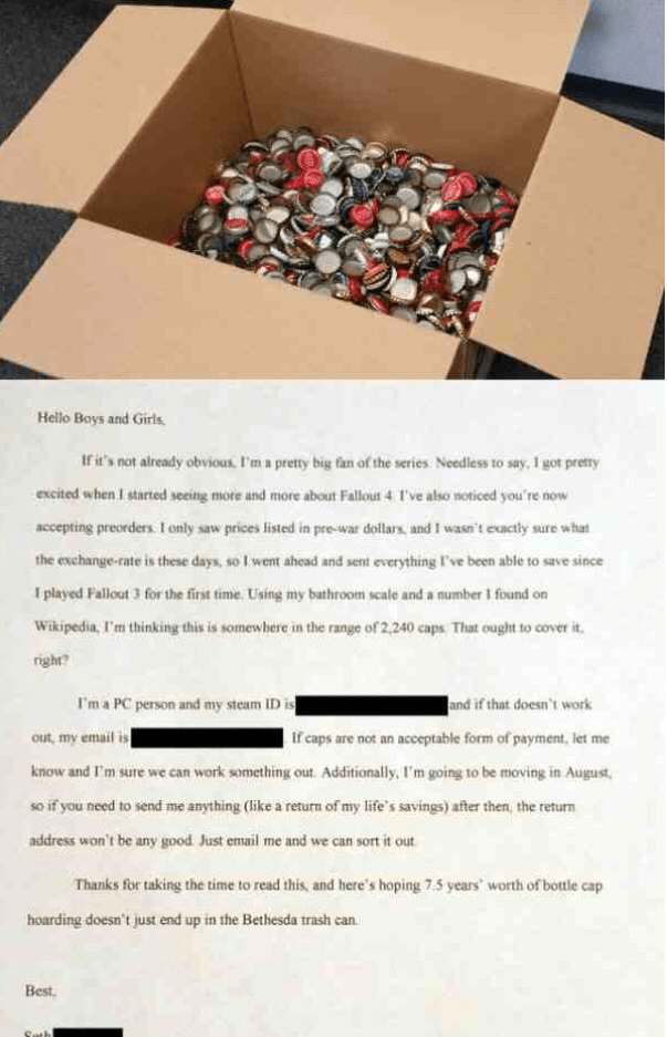 Imgur user GatorMacheteJr, or Seth as his letter shows, sent in over eleven pounds of bottlecaps as compensation for a preorder. With bottlecaps being the currency of choice in the post apocalyptic wastelands in Fallout, it was an innovative idea and one that paid dividends. Bethesda has said that since he was the first person to try this, they would accept that as payment.