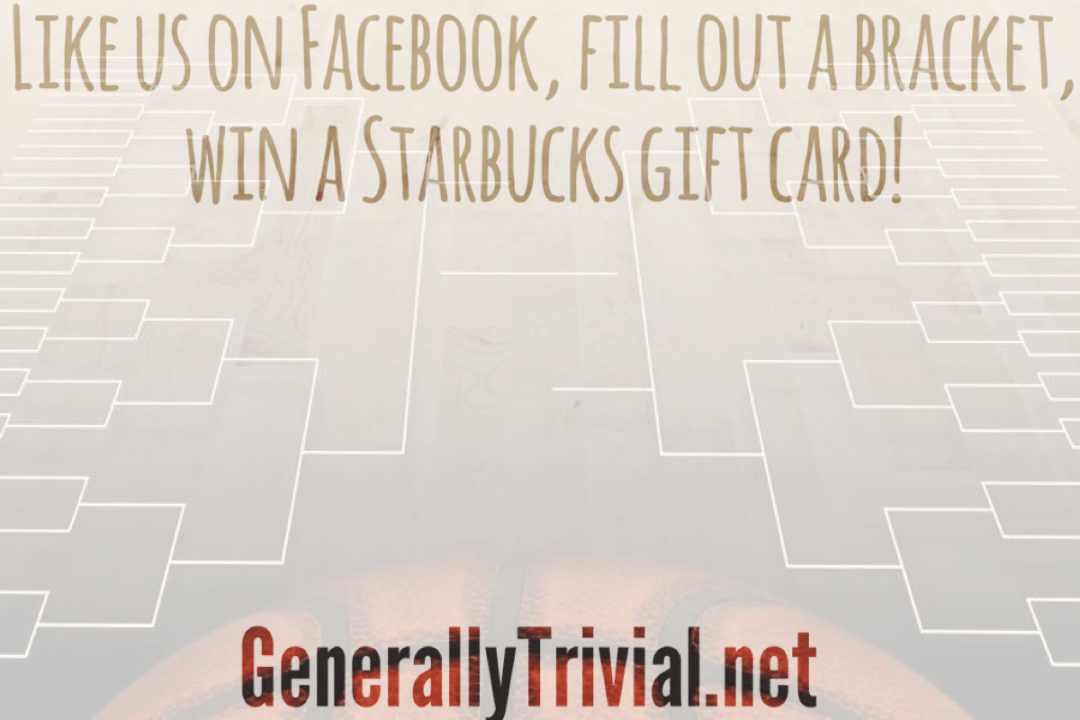 March Madness is upon us once again. And to help spread the madness,we’re doing a NCAA tournament bracket on ESPN. The winner will receive a twenty dollar Starbucks gift card! The winner must also have the ‘Generally Trivial’ Facebook page liked. But that’s it. Like the page, submit a bracket, profit.